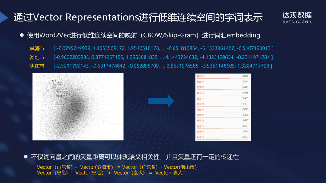 在2013年谷歌开源一款用于词向量计算的工具word2Vec,引起了学术界和工业界的关注。达观基于word2Vec的相关应用非常普遍。word2Vec可以在百万数量级或上亿数据集上进行高效训练,词向量更好的解决度量词与词之间的相似性,词向量之间的矢量距离也可以体现语义的相关性,并且这个矢量还有一定传递性。