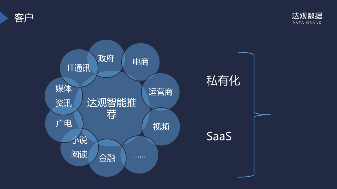 从行业来说,达观智能推荐服务的的客户覆盖了媒体、视频、电商、小说阅读和金融等多个业务场景。市面所有的推荐场景,达观都有相关的优化或者需求开发的实战经验。