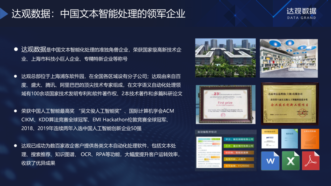 首先简单介绍下我们公司。达观数据是中国文本智能化处理领域的领军企业,曾先后获得国家级高新技术企业、上海市科技小巨人企业等称号,是中国文本智能化处理领域的准独角兽企业。总部位于上海浦东软件园,核心团队由来自于BAT的顶尖技术专家组成。