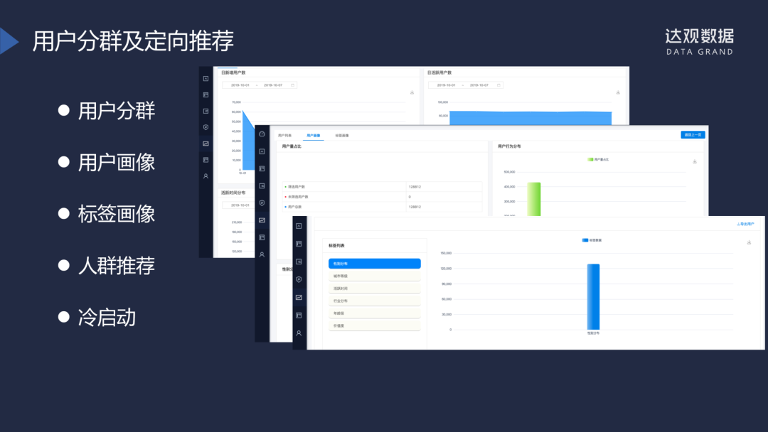 推荐系统的迭代优化和精细化运营很多都是围绕用户来展开。结合用户的属性、行为数据的分布和用户的心理偏好等各种维度的标签信息可以进行用户群体的划分。可以展示用户列表以及群体画像,针对特定的用户群体可以进行人群的定向推荐,也可以做个性化的push。