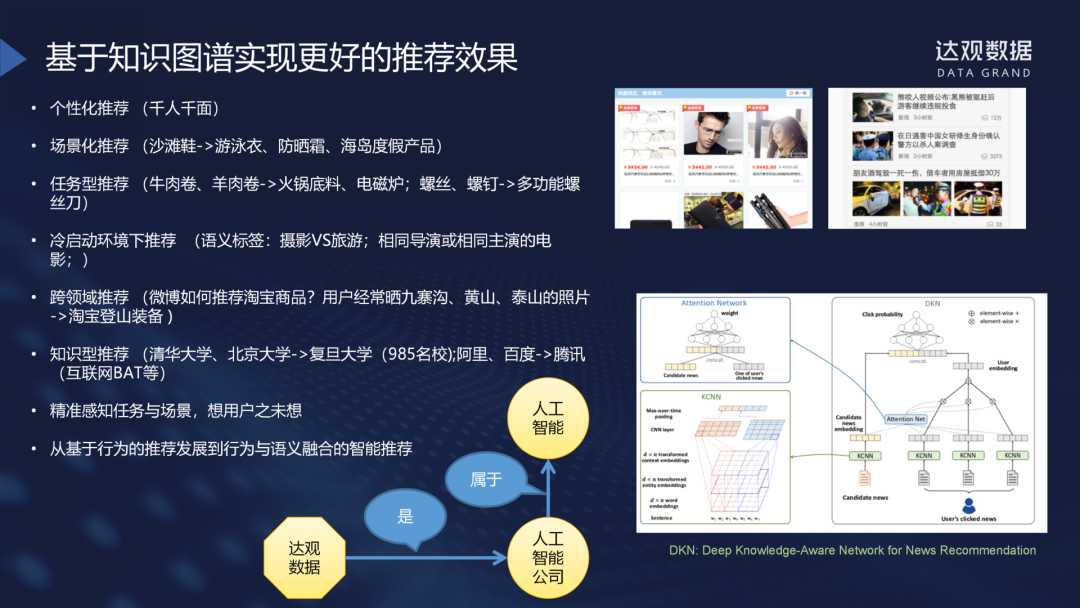 在达观的推荐体系中广泛应用的基于知识图谱的推荐,通过各种构建的领域知识图谱,我们可以进行推荐结果的召回、推荐结果的解释还有排序等相关工作。这部分和专家规则类似,推荐结果准确率往往比较高。另外,我们可以借助知识图谱的推理能力,推荐出一些用户认为惊喜度特别高的内容。