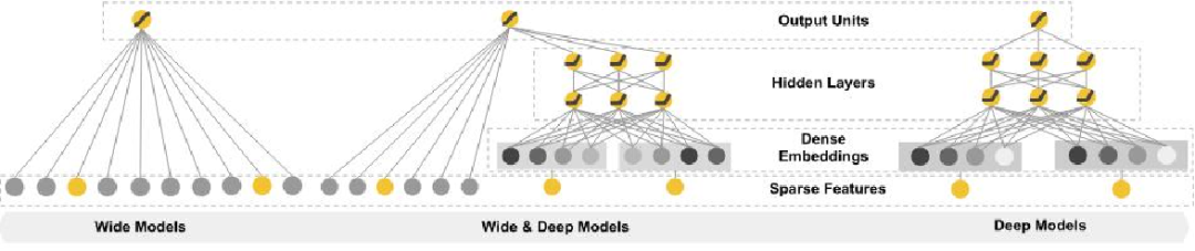 Wide&Deep模型在2016年提出,Wide部分是线性模型+特征组合的方式,优点是记忆性好、可解释性强,Wide部分可以手动的进行特征交叉。Deep部分主要是利用MLP实现高阶特征交叉,所以Wide部分和Deep部分经过联合训练,就可以得到比较好的结果。早期在谷歌play上推荐效果获得一定量的提升。Wide&Deep主要是应用在排序模型阶段,就是LTR这块的。