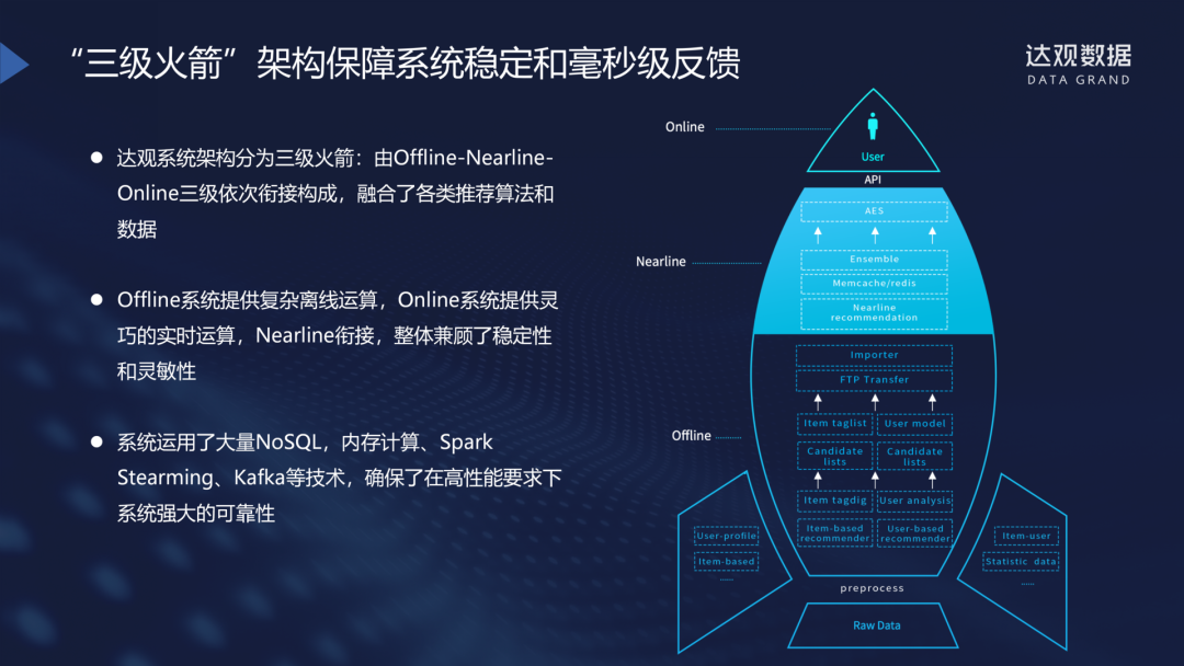 达观智能推荐有“三级火箭”机制,分为离线、近线和在线三层,离线主要是大数据复杂计算的;在线是高并发、毫秒级的返回推荐结果;近线是进行中间的衔接,它主要保证系统稳定性和灵敏性,大量使用NoSQL、内存计算、卡夫卡等技术。