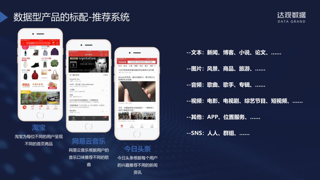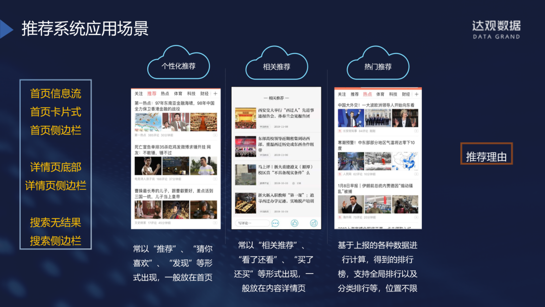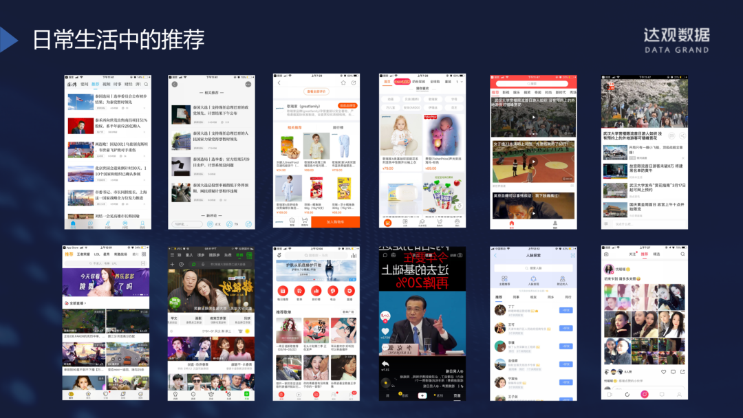 产品标配的推荐系统有各种各样的推荐场景,文本、图片、音频、视频、好友推荐……现在日常我们能看到的各种各样推荐产品,达观都服务过类似的客户。