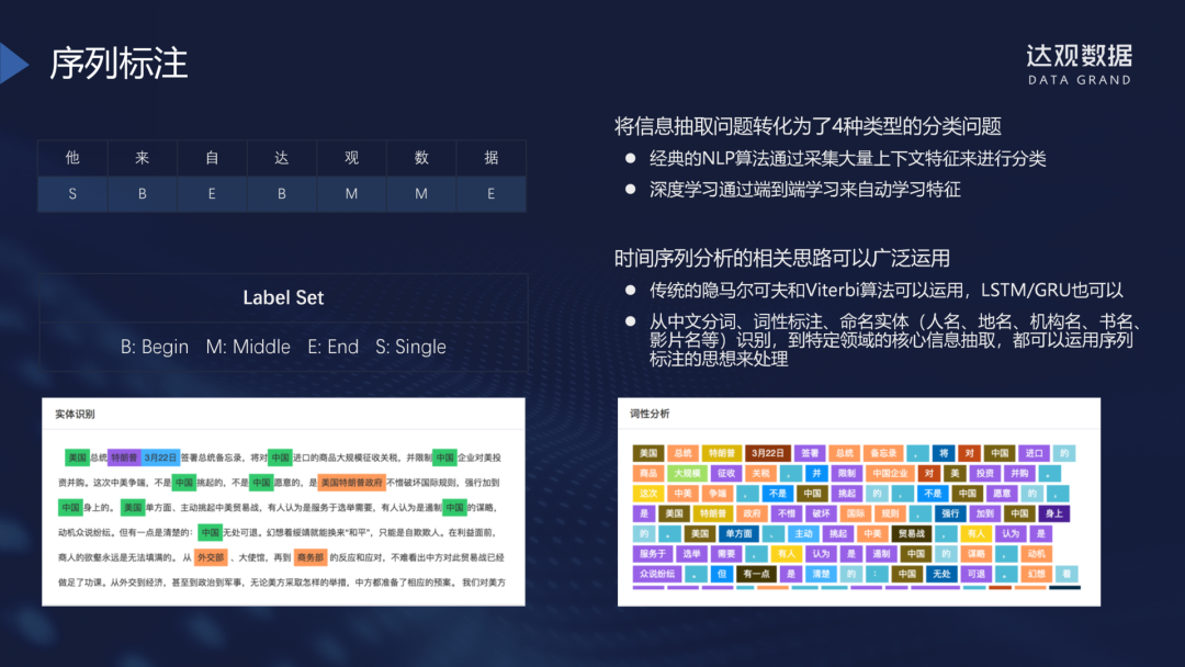 序列化标注就是把信息抽取问题转化为四种类型的分类问题。时间序列分析的相关思路也可以广泛应用——常用的序列标注模型有隐马尔科夫模型还有条件随机场,深度学习模型Bi-LSTM+CRF等,经过模型的处理,最终可以从海量文本内容里面提取关键的高价值信息。