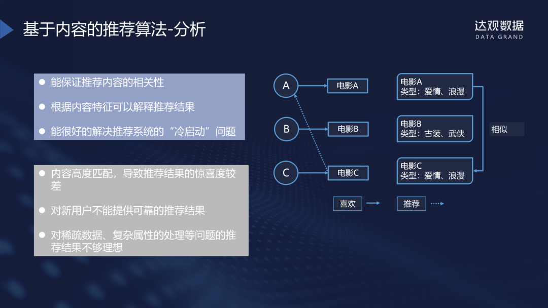除了深度学习之外,内容推荐主要是各种文本匹配的,比如标签相似度到类型的推荐。这种推荐的算法,结果相关性比较好,可解释行比较强,对冷启动问题也有很好的解决,但它是大量的文本进行匹配的,一般惊喜度比较差。对于一些复杂或者稀疏的数据来说,推荐结果不够理想。