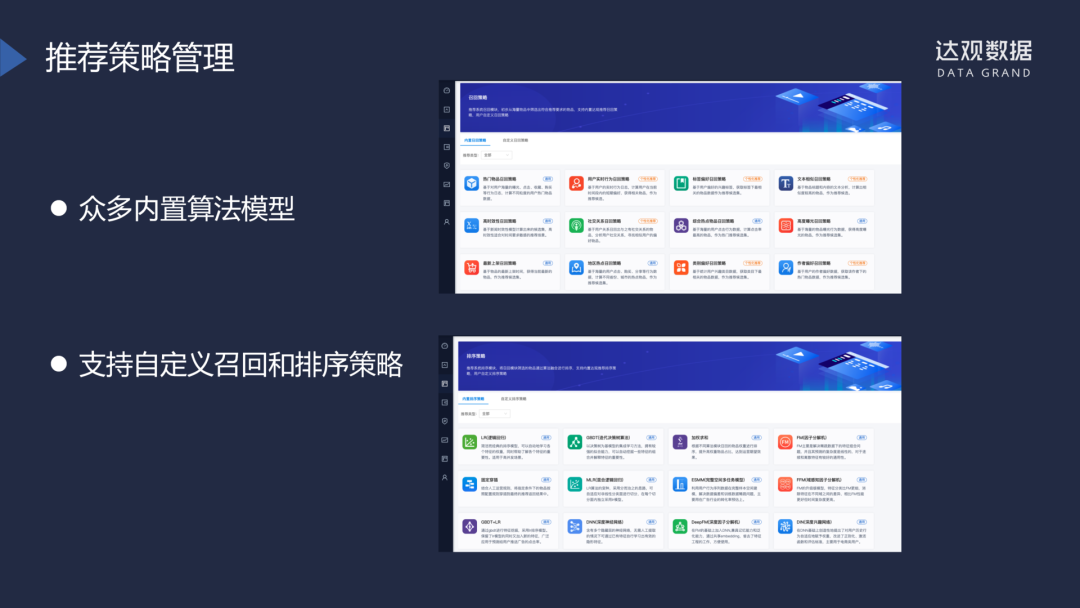 推荐结果本身有大量的召回算法和排序模型需要处理,达观智能推荐做产品化过程时已经内置了数十种常用的算法模型,可以满足绝大部分推荐业务场景需求。