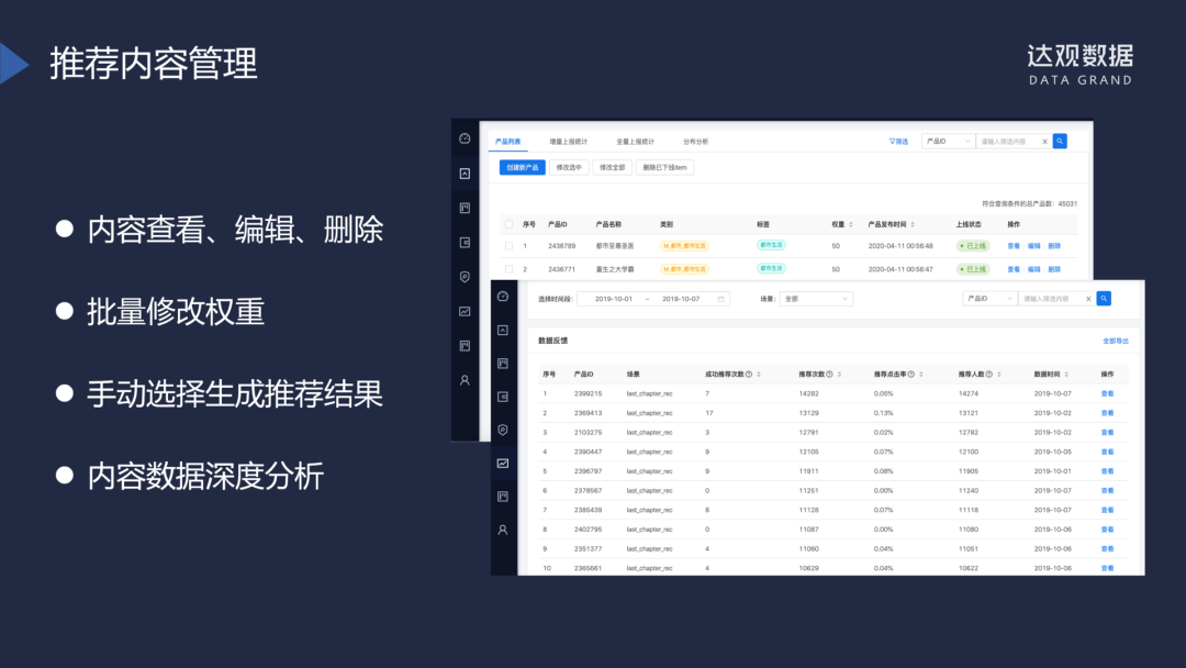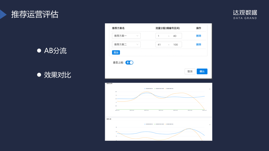 达观智能推荐后台支持直接配置流量划分,进行线上效果评估,分流支持多策略,无论是做运营规则还是做算法,可以在同一个场景里做多种流量的分配测试。除了配置流量分流之外,我们还有数据统计的后台。它可以提供各种量化指标,可以看到不同流量指标的明确变化。