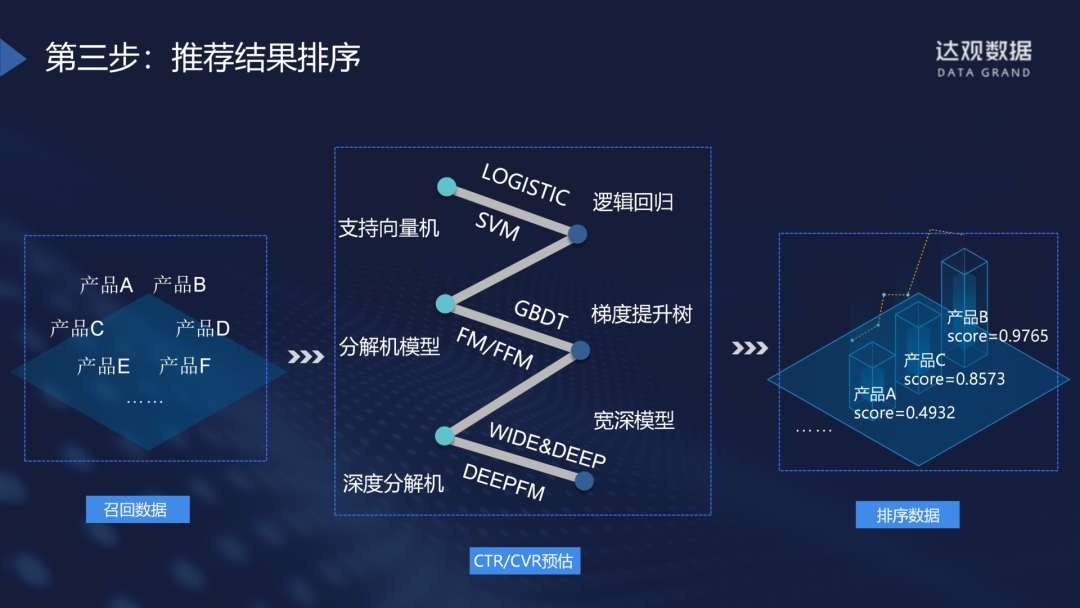 有了召回的推荐候选集,接下来我们会使用机器排序模型来进行处理。主要围绕CTR、CVR预估展开。达观的算法模型库支持可插拔操作,根据实际的推荐场景来进行算法模型的预选,然后进行针对性的调优,经过排序模型的处理后,推荐预选集的物品就会有各种各样的预估score,将score从高到低排序后即可得到优先推荐机制。