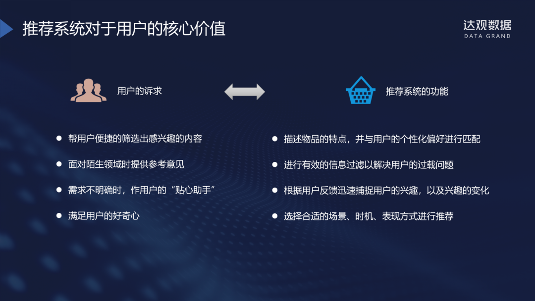 个性化推荐搭起了用户和内容间的桥梁。从用户角度,筛选出喜好的内容;从内容角度,筛选出匹配的用户群;结合用户行为反馈的变化,进行实时分析挖掘、进行实时推荐,保证推荐内容的时效性、多样性,时刻给用户惊喜的结果。