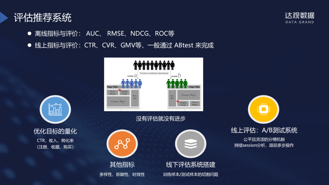 业界普遍采用的推荐运营评估方法是线上进行AB测试。通过在同样产品的场景之下进行不同的流量划分,一部分流量可以作为基础的,另外一部分流量可以进行线上分流测试。观察一段时间之后,查看点击率、人均点击、人均停留时长、购买转化等指标的趋势变化。