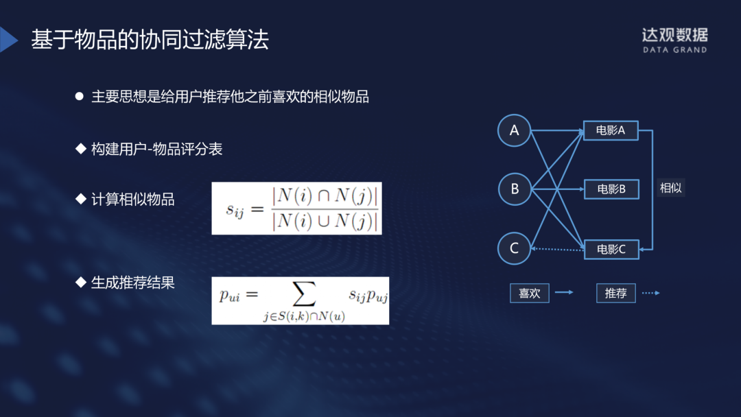 基于物品的协同过滤:通过计算相似物品的列表,把用户偏好相似的物品推荐出来,它主要牵扯到用户对物品的偏好以及物品相似度计算。在实际应用里面,相似度有很多种,我们要考虑热门物品或者冷门物品的影响,包括一些作弊机制作弊数据的防范等,有大量变形。