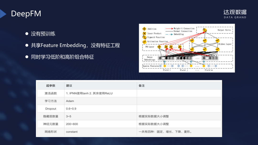 2、FNN是把FM的这个隐向量参数直接作为网络参数学习,这样DeepFM可以将Embedding层的结果输入给FM和MLP,两者通过输出叠加,最终可以达到捕捉低阶和高阶特征交叉的目的。