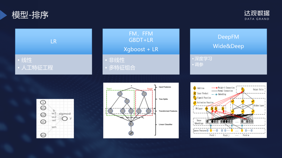 排序模型从线性模型到非线性模型,再到深度模型。我们会结合我们所服务的新闻资讯、视频、商品、金融等领域,有针对性的选择一些排序模型。线性模型一般依赖人工特征工程,非线性模型更好的来进行多特征融合,深度学习模型是各种超参的调优。我们在实际应用中会基于用户实际推荐场景和客户数据进行有针对性的选择。