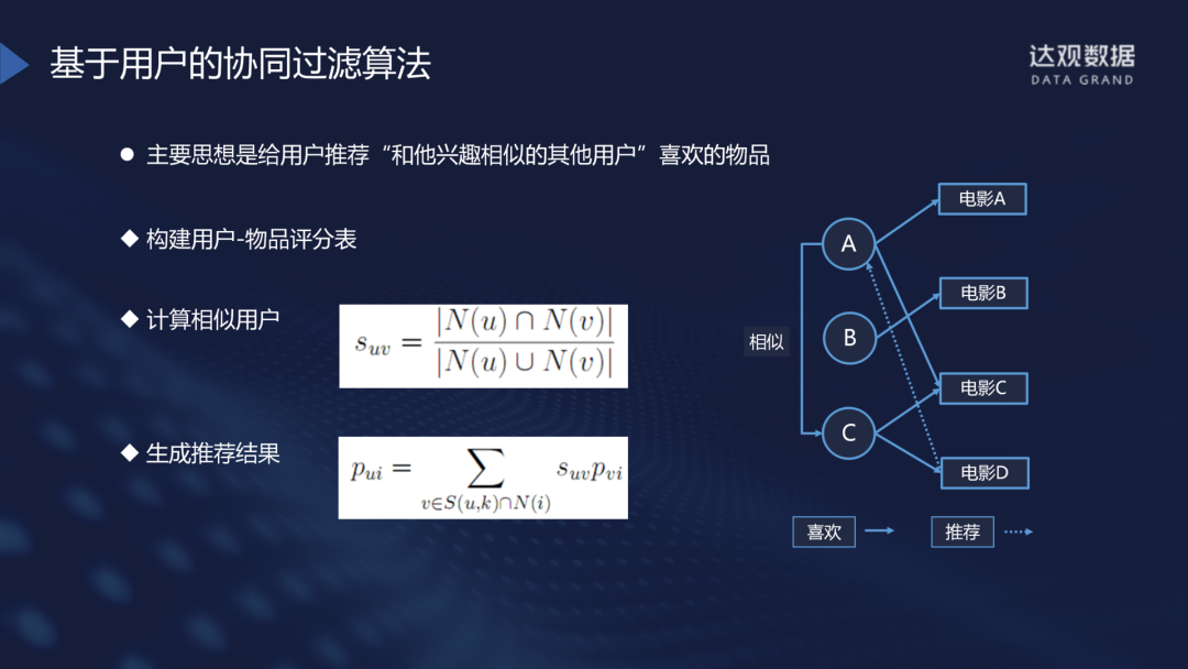 基于用户的过滤:首先找到和当前用户相似的用户列表,把感兴趣的物品推荐给当前用户,这里主要牵扯到用户相似度和用户感兴趣列表计算。