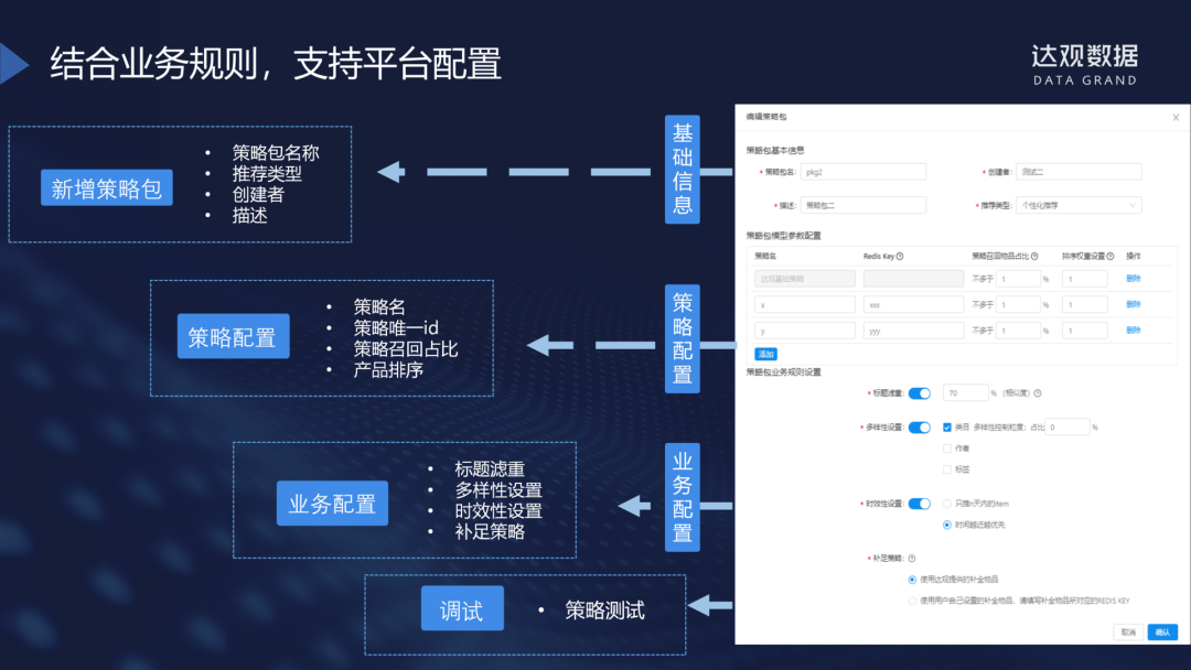 好的推荐产品要有很好的开放性,运营规则、算法调整、效果调优在很多应用不需要停留在改代码阶段。可以让技术、运营、产品经理等角色都可以加入产品化后台进来进行深度干预。通过推荐的各种召回算法、排序过程、后处理逻辑等都可以灵活的通过页面来进行配置,并且我们还有一些效果评估机制,提供相对应的量化指标数据,提供一些数据上的支撑。