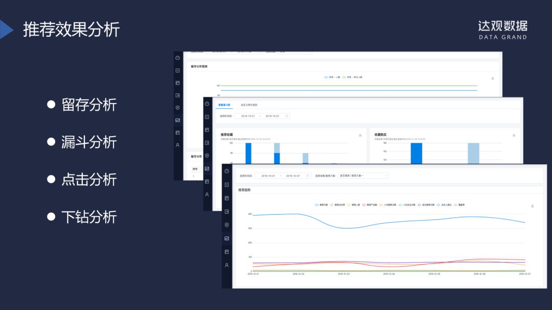 推荐效果有很多量化指标数据,包括留存分析(次日的、7日的或者月度的)、用户转化漏斗分析(点击、收藏、加购物车、购买等漏斗转化规则可自行配置)、推荐点击的分析、各种策略或算法的下钻分析等。图表结合的方式可以更好地展示智能推荐和精细化运营相互作用的效果趋势变化情况。这些数据都可以下载,方便使用者进行二次分析和加工。