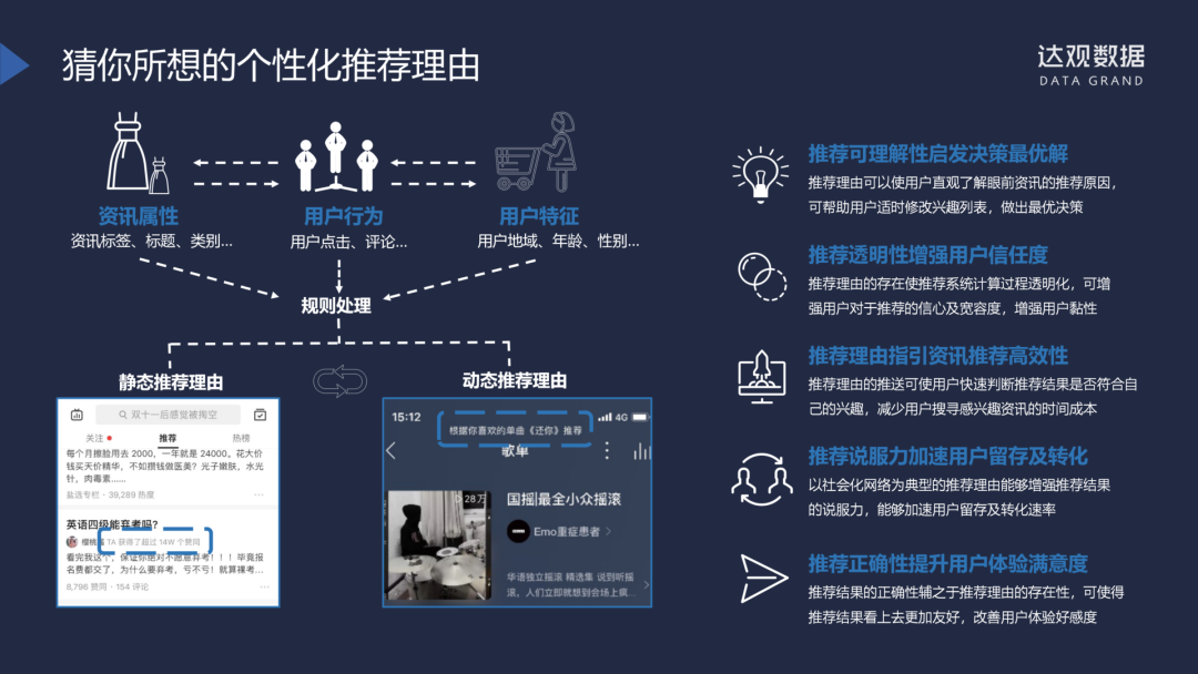 除了推荐结果之外,我们可以增加个性化推荐理由。个性化推荐理由是基于内容属性、用户行为、用户特征等生成的,分为静态推荐理由和动态推荐理由。个性化推荐理由对推荐结果有更好解释性,可以增加用户信任度,增强用户体验,从而能更好的采集用户反馈,进行更好的精细化运营。