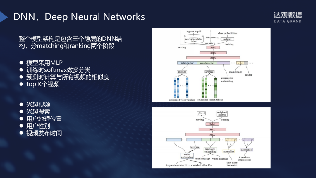 深度学习这个算法广泛应用在推荐系统里,尤其是DNN。DNN是谷歌YouTube这个团队进行了大量的尝试,公开的论文在2016年9月的RecSys会议上发表。DNN的应用主要面临数据规模很大、更新很快切噪音数据比较多的问题,在实践过程中分两个阶段:matching阶段和ranking阶段。