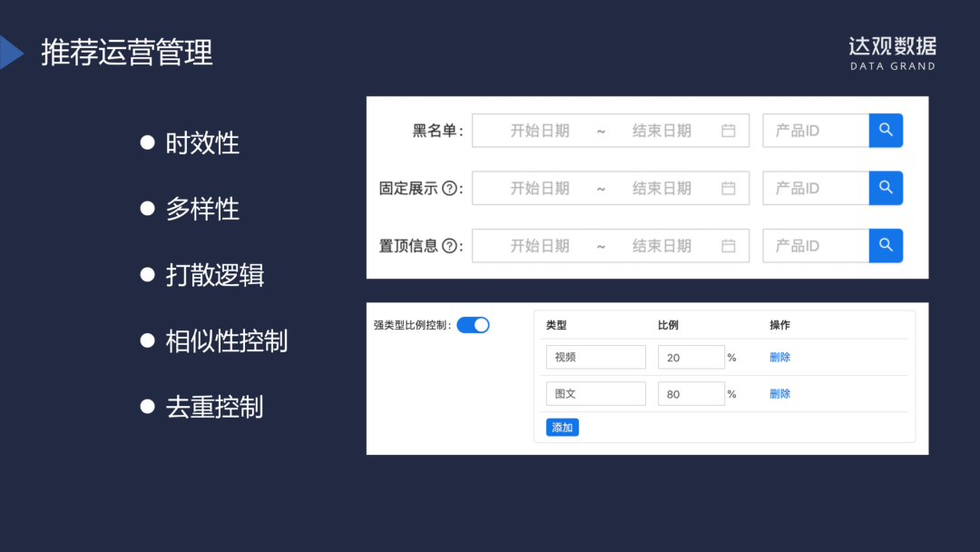 例如资讯类这种首页产品,我们会限定视频和图文的比例。10条内容推荐结果中20%是视频,80%是图文,而且视频是不能连续。这些都可以通过达观智能推荐的后台设置干预项。