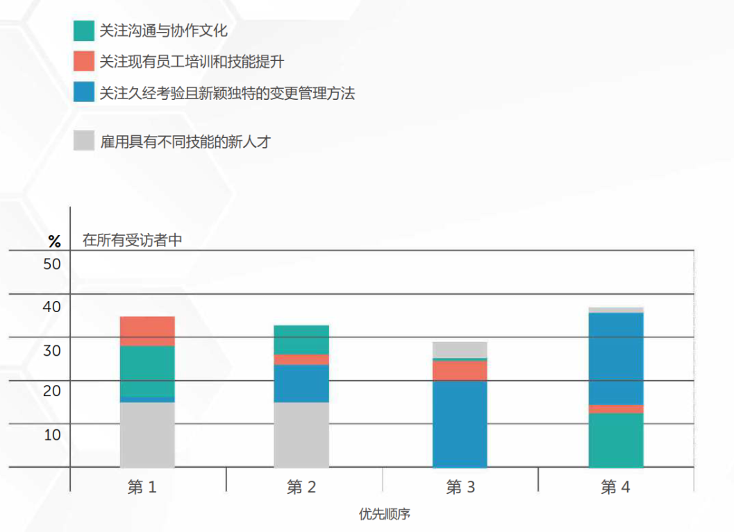 文化与现有员工培训及规模扩大和技能提升是公认候选名单中优先级最高的两大选项。至于关注久经考验的方法(如变更管理)或者雇用新人才,其驱动因素不必相同。从这里的结果可以看出,建立面向未来的企业不一定需要安排新人才。