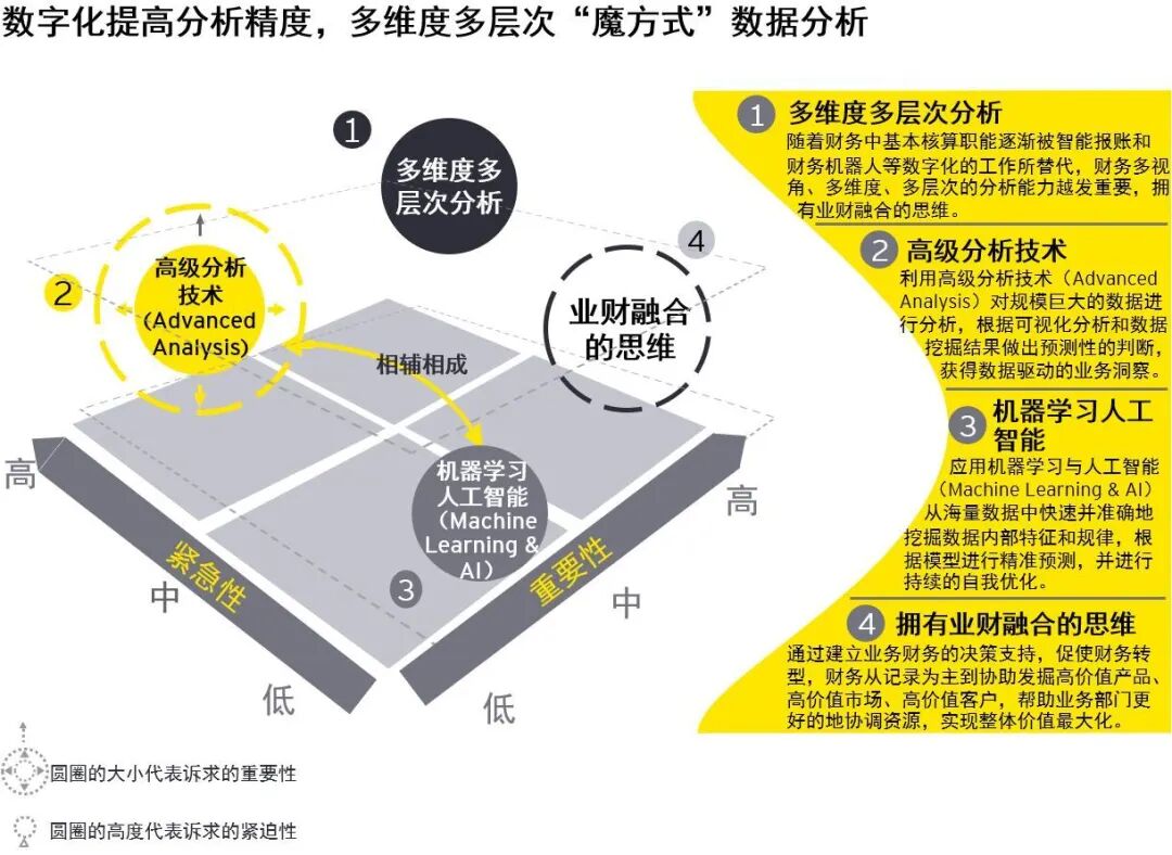 随着财务中基本核算职能逐渐被智能报账和财务机器人等数字化的工具替代,财务多视角、多维度、多层次的分析能力越发重要,不止是从财务角度分析财务情况,更是拥有业财融合的思维,可以站在业务角度看财务、站在财务角度看业务,从而在风险把控、经营决策等方面为企业管理者提供相关的建议。