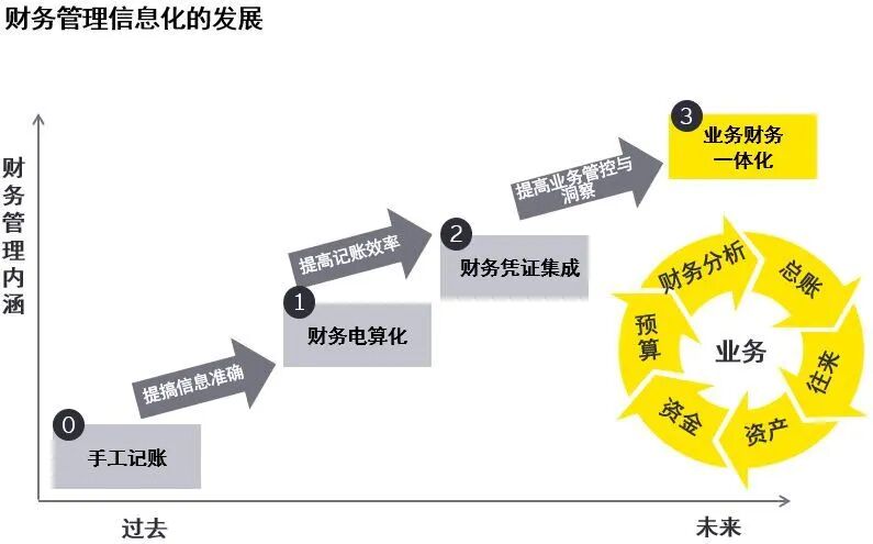 财务信息化是中国经营管理信息化的排头兵,国家在1983年就提出财务信息化的要求。管理和经营之间相互作用又相互影响,财务信息工作以手工记账为起点,经历了财务电算化、财务凭证集成、业务财务一体化三个阶段,取得了跨越式的发展。企业逐步从管结果,到管方向,再到管过程,财务职能对企业战略提供了更多更好更快的支撑。
