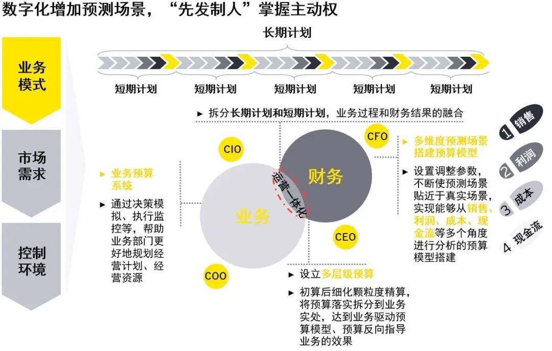 当今业务模式、市场需求、控制环境的快速变化要求财务管控不仅仅需要跟上节奏,更要“先发制人”。利用数字化技术预测场景进行决策,成为企业掌握主动权的制胜法宝。同时根据多维度预测场景搭建预算模型,深化业财融合,实现运营一体化。