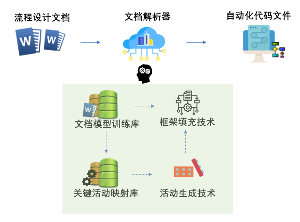 天行团队结合国外产品先驱的经验,以及以往项目建设过程中的经验,尝试着融合以上的三种方式,提出了“自动化你的自动化过程“概念,通过理解用户的流程设计文档,辅以用户的训练,实现RPA代码的自动化生成。