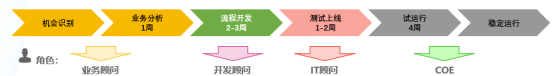 但,即使RPA项目相比传统的软件项目管理复杂度和开发难度都有所降低,当前RPA项目建设依然需要一定的技术基础。以一个常见的流程自动化项目为例,往往需要经历:机会识别、业务分析、流程开发、测试上线、试运行及运维等几个阶段,其中需要技术基础的流程开发阶段一般需要2-3周的时间。