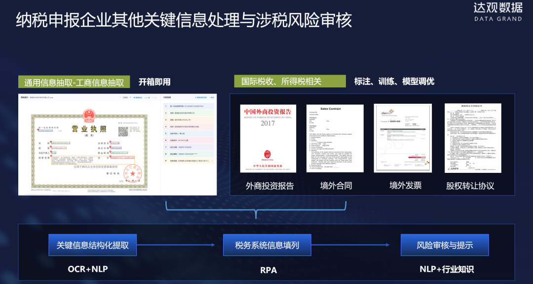 在企业财税领域,达观智能财务机器人通过自动化与智能化技术结合,解决工作的出现的重复性高、易出错的问题,提高企业财务人员的工作效率。