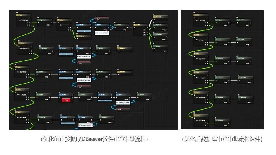 由于审查审批流程会经过多个部门岗位的扭转,而且不能预判下一个岗位扭转的具体人员,因此,我们需要在流程执行的过程中频繁地访问数据库来定位最新流程的位置。测试人员在测试的时候使用DBeaver软件手工执行数据库语句进行查询,每审批完一个岗位就需要去数据库查看流程扭转的最新位置。若完全模拟测试人员的手工操,我们需要频繁的和DBeaver工具进行交互,这样会让流程组件变得很长。(见下图左)