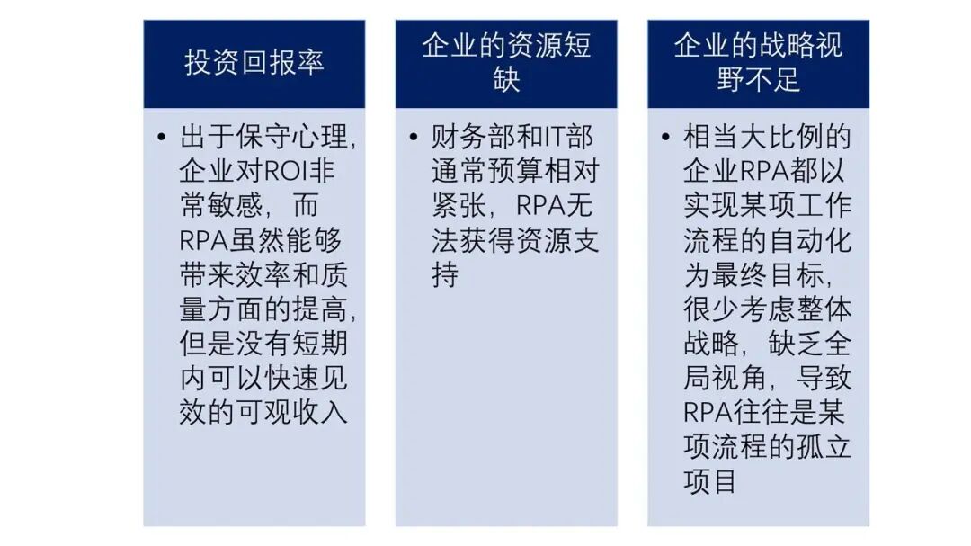另外,RPA厂商一般销售的都是通用产品,而其应用到客户时,都需要个性化。但如果想要实现RPA的个性化可用场景,则需要投入大量成本进行个性化定制,增加了应用的难度。