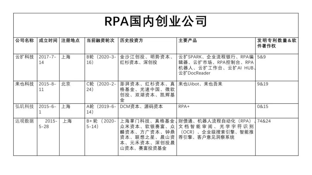 近年来,来也科技、云扩科技、弘玑科技、达观数据等RPA创业公司也陆续获得了融资。