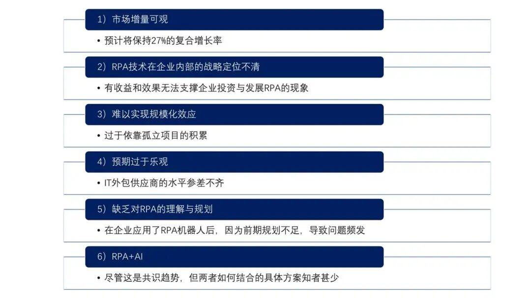 经过了2016年以来的发展,RPA市场玩家多了起来,竞争升级。同时,经过几年的终端应用,市场逐渐发现了机器人维护、新需求挖掘和新技术孵化等方面的问题,暴露了RPA领域的前期标准和规范的缺失。一部分下游企业客户,开始重视对供应商的筛选,甚至尝试自研RPA系统。