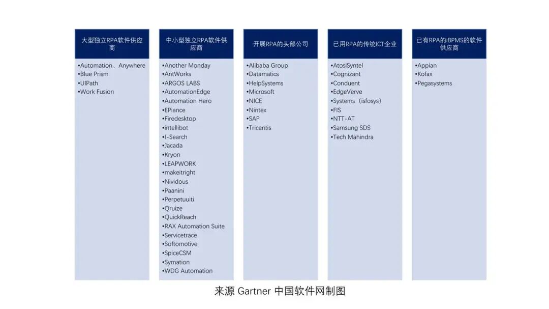 今年,前文中所发的Gartner的RPA厂商统计中,也开始出现了中国厂商的身影。I-Search(艺赛旗软件)、AlibabaGroup(阿里巴巴集团)、Encoo(云扩科技)均有露面。