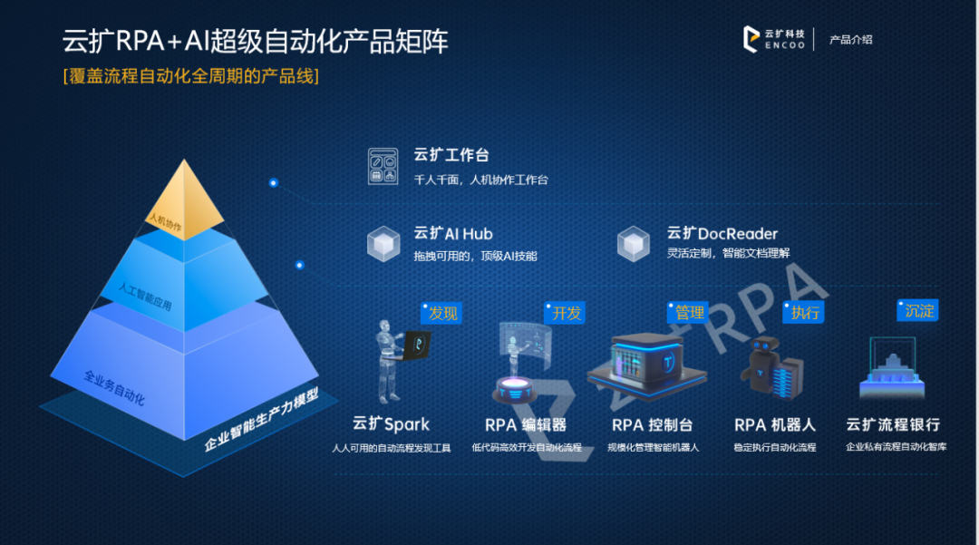 云扩端到端的流程自动化产品,从流程的发现到流程的实施、到流程自动化的管理、再到流程的执行、最后到COE的赋能,可以赋予每个企业全业务自动化的能力。