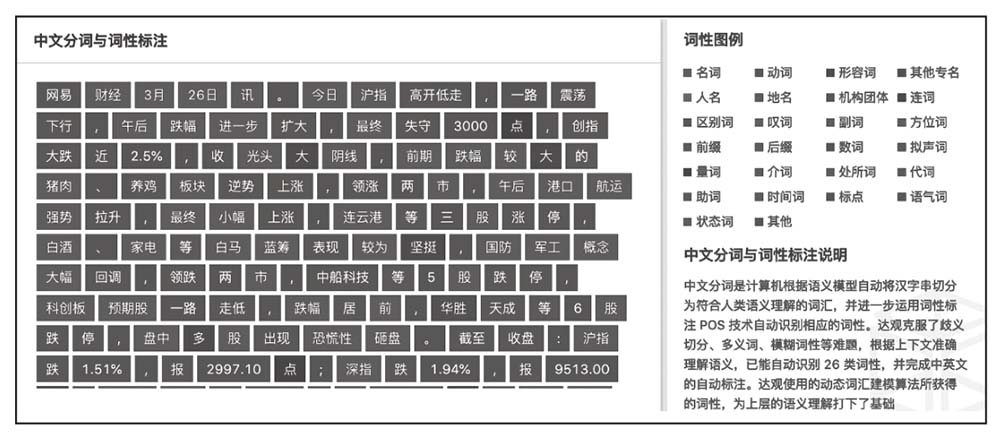 词性标注(Part-of-Speech tagging或POS tagging)又称词类标注,是指为分词结果中的每个单词标注一个正确的词性的程序。具体来说就是,确定每个词是名词、动词、形容词或者是其他词性的过程(如图3-2所示)。