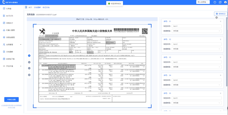 在申报过程中用户需要从报关单中提取很多文本信息进行填写,此时就可以通过文档理解服务系统配置模板来实现文本信息智能抽取。