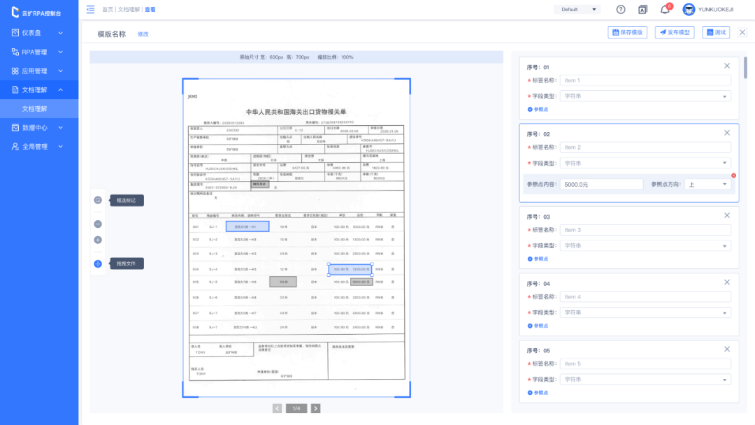 云扩DocReader集成了 OCR 、NLP机器学习等人工智能技术,能够在少量样本的情况下,对各类文档进行智能的识别和信息的抽取, 让企业的业务用户可以快捷地制作一个特定文档的识别模型,从这些文档中拾取信息,交给 RPA 机器人进行后续的处理。