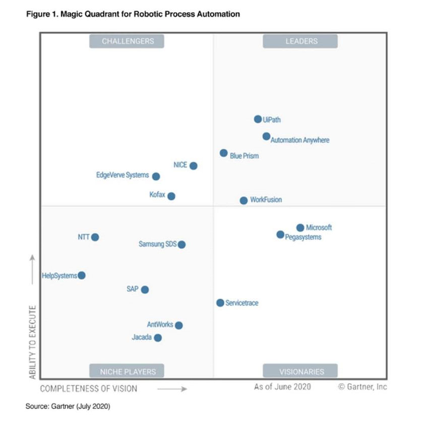 前不久,在Gartner发布的《2020年RPA行业魔力象限》中,微软、SAP等软件企业首次入选。
