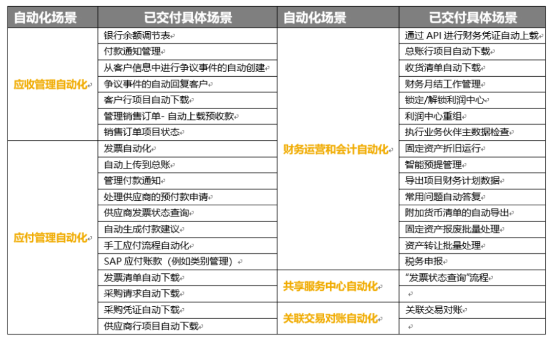 “开箱即用”的业务场景- SAP为实现自动化发票管理和协同;在财务月结期间自动执行对账;实现共享服务中心自动化的数据管理;使用软件机器人将部分财务帮助工作台操作数字化;将应收账款流程中的手动任务自动化;将应付账款流程中的手动任务自动化;将SAP系统与财务人员钟爱的万能excel、其他多种工具、系统与机器人结合起来。在SAP Intelligent RPA投入市场的几个月时间,已经提供30多个开箱即用的财务场景,详见下表。但SAP Intelligent RPA所提供的场景不会就此止步,客户的需求在哪里,SAP会随时跟进。