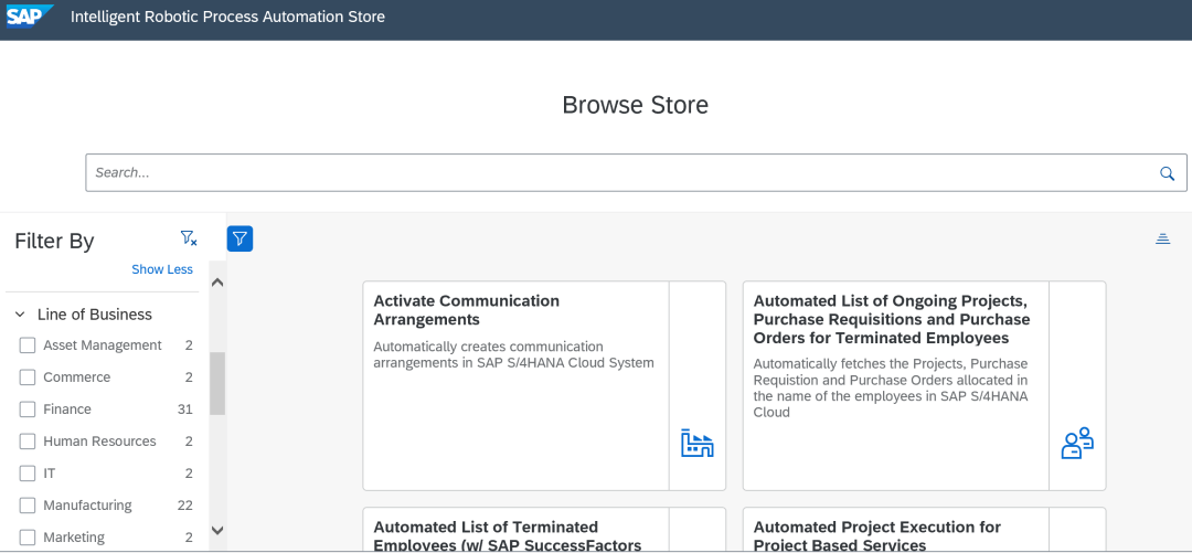 “一站式访问”:SAP机器人商店(SAP Bot Store)。通过SAP机器人商店,您可以通过更快、更容易的渠道访问SAP所提供的机器人内容。SAP机器人商店与SAP智能机器人流程自动化工厂完全集成,我们的客户可以随时使用。您可以找到我们预先构建的机器人,并直接将它们部署到您的租用订阅中,而无需任何文件导入和导出的麻烦。