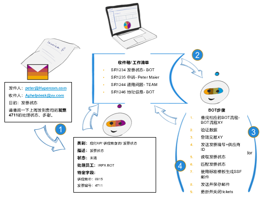 我们看一个企业财务共享服务中心最常见的场景:供应商查询发票的处理状态- 共享服务中心前台需要根据供应商查询信息,生成服务请求,并派单给应付会计团队;应付会计团队的相关人员接单后,登陆系统查询后回答供应商的问题,并提供相关信息。看似简单,却是共享中心非常耗时又需要认真对待的一项重要工作。SAP Intelligent RPA针对该场景,能提供什么不同的智能化服务呢?将对SAP系统中的供应商发票及相关信息查询集成到机器学习和机器人流程自动化中,提供了端到端的流程自动化能力,有助于共享服务中心实现卓越的运营。SAP Intelligent RPA的实现过程如下图所示: