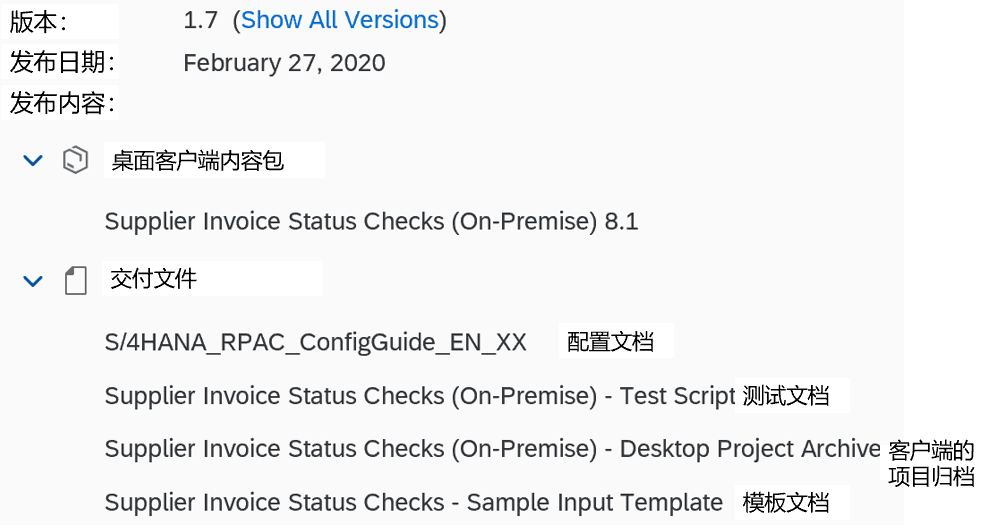 第一,部署快。SAP已经交付了开箱即用的财务、采购、生产、销售等60多个业务场景。针对每个场景,SAP还交付全套配置、测试、应用模板(针对上述的“供应商发票状态查询”场景,SAP预交付的内容如下图所示),只要短短两周的时间,客户就可以马上使用到SAP Intelligent RPA的应用。