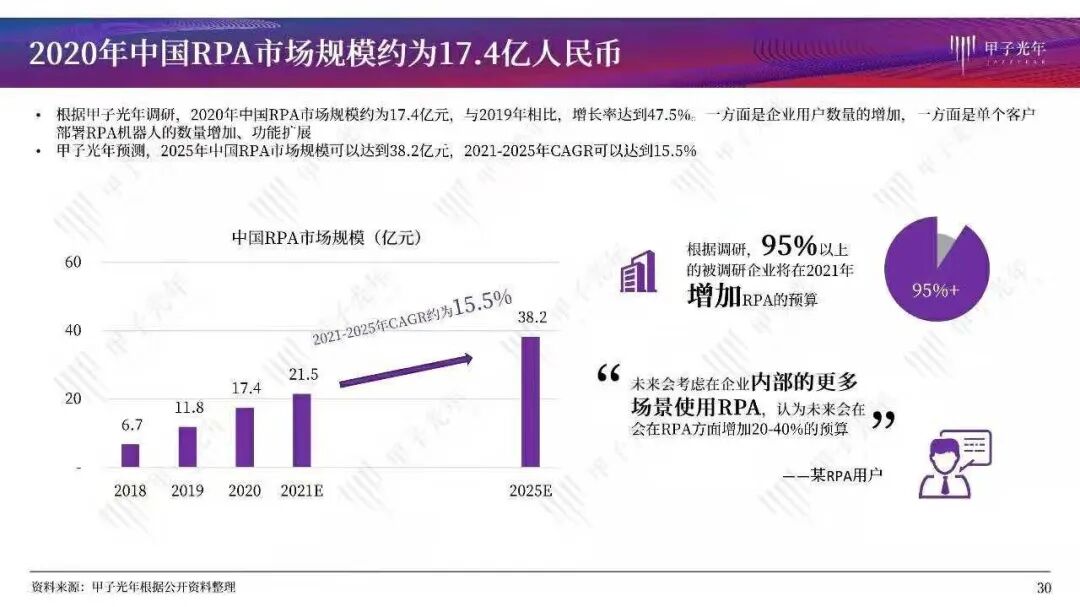 甲子光年2021年中国RPA发展报告显示,由于RPA技术突出的经济效益,2020年全球RPA市场规模约为17.4亿美元,且在过去数年始终保持47.5%左右的超高增速,已经成为全球IT服务市场增速最快的赛道之一。如此有潜力的技术,为何才被市场发掘,是明珠蒙尘,还是其他原因呢?