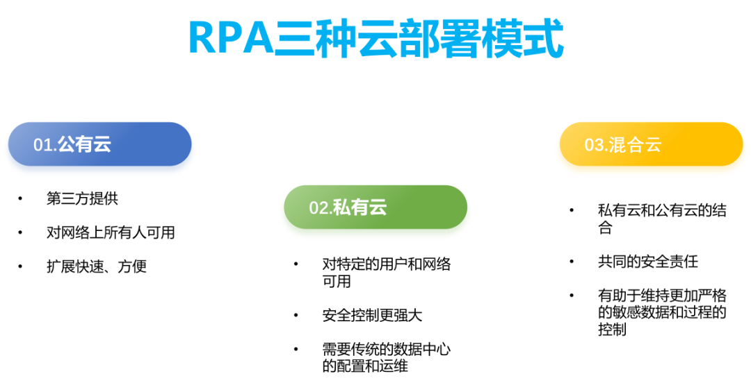 全球云化的浪潮席卷着To B市场,RPA也不例外。由于RPA需要深入到企业的各个流程中,从少量部署升级为规模化部署,从单个部门或岗位的个人生产力工具升级为企业级的数字化劳动力平台,简单的桌面端部署将无法满足未来企业数据指数级增加的处理需求,因此“上云”是RPA厂商的必然选择。