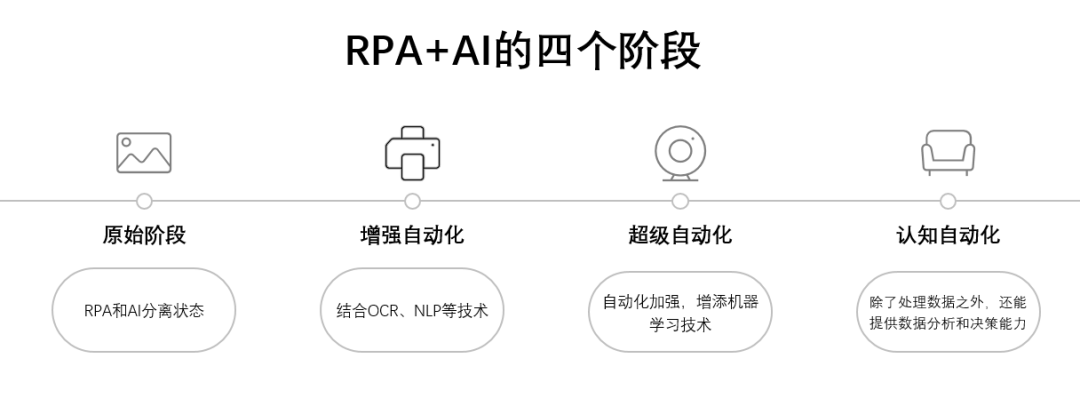 2020年,几乎所有的RPA厂商都开始主导以“AI+RPA”数字员工的概念来大炒RPA行业的知名度。然而可以预见的是,在很长的一段时间,AI与RPA的结合仍将处在「增强自动化/超级自动化」阶段内,即通过OCR、NLP等技术自动处理非结构化的数据,还能通过机器学习(ML)进行简单的判断,从而提升RPA产品的实用性。