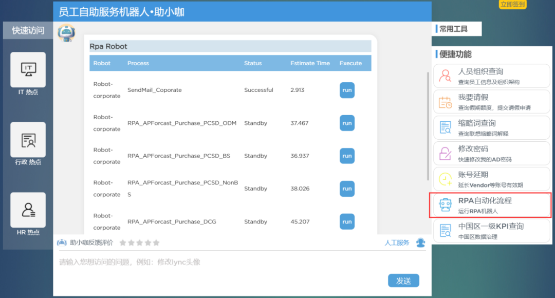 效果:实现机器人的跨界合作,用户不需要登录RPA管理平台,通过和对话机器人的互动完成不定时的作业,如图,用户可以通过对话框输入RPA或者点击快捷栏直接访问RPA功能,并且根据权限配置,用户只能看到其有权限执行的部分RPA流程,点击运行按键就能直接调度RPA自动化流程,并且可以直观的看到流程的状态以及预估需要运行的时长。