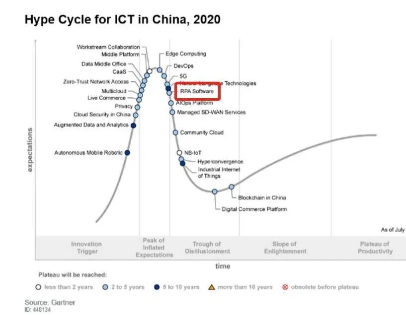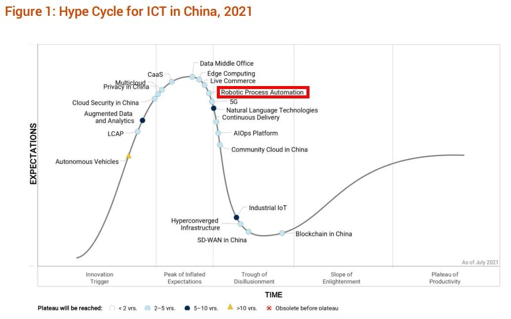 先是在7月21日,Gartner发布年度重磅报告《2021年中国ICT技术成熟度曲线》报告,其中的RPA技术板块,国产RPA有5家被推荐,来也科技更是在RPA、NLT两项技术领域入选。
